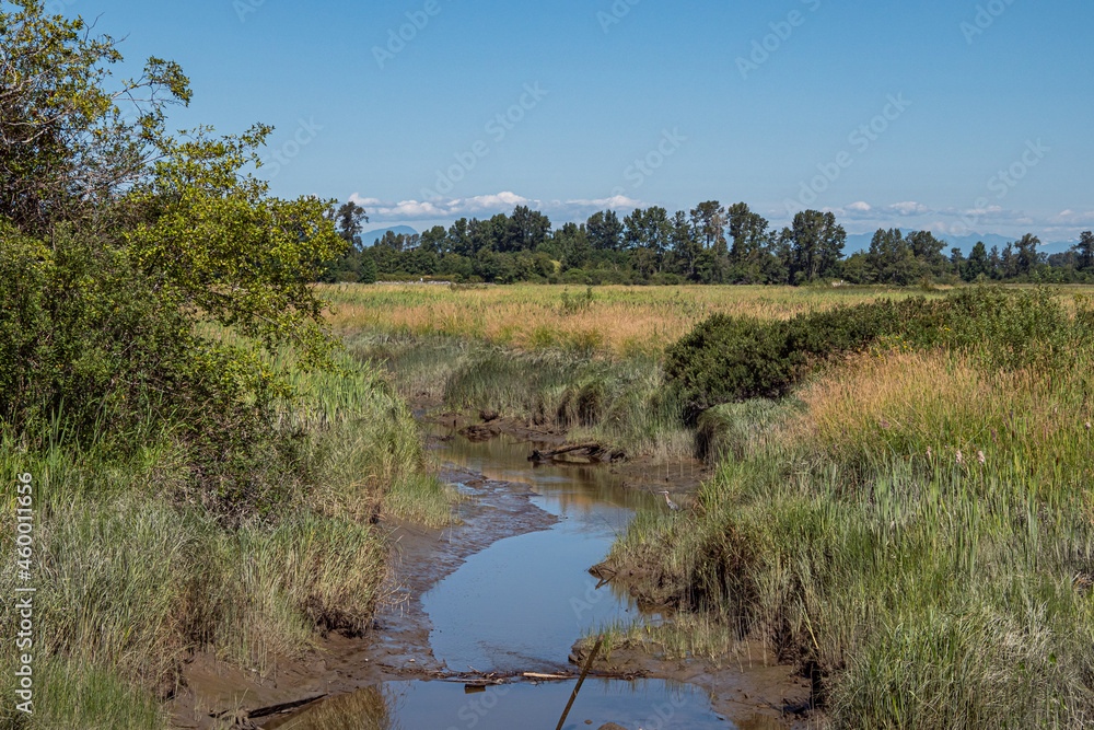 view of the wetland with a waterway go through the dense green grasses on a sunny day