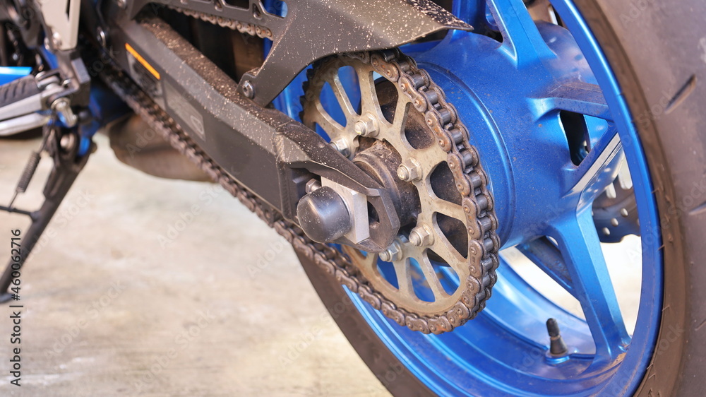 Rear wheel hub with chain on dirty plate. Transmission system on the rear wheel of the motorcycle parked on concrete. selective focus