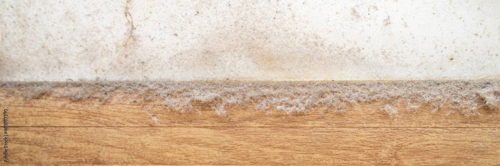 dust in the corner of the room. real old neglected dusty dirt, dirty toxic mold and fungus bacteria on the white wall, skirting board and wooden floor in the home in the apartment close up. banner