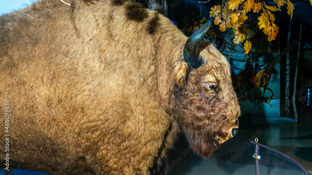 A stuffed European bison. Taxidermy bison with horn and brown fur. Animal concept.