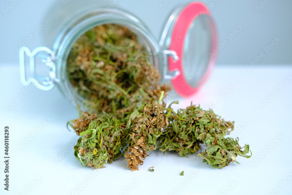 close-up green hemp buds in a glass jar for safekeeping on gray background, medical marijuana laboratory scientific research, green cannabis plants, harvest concept