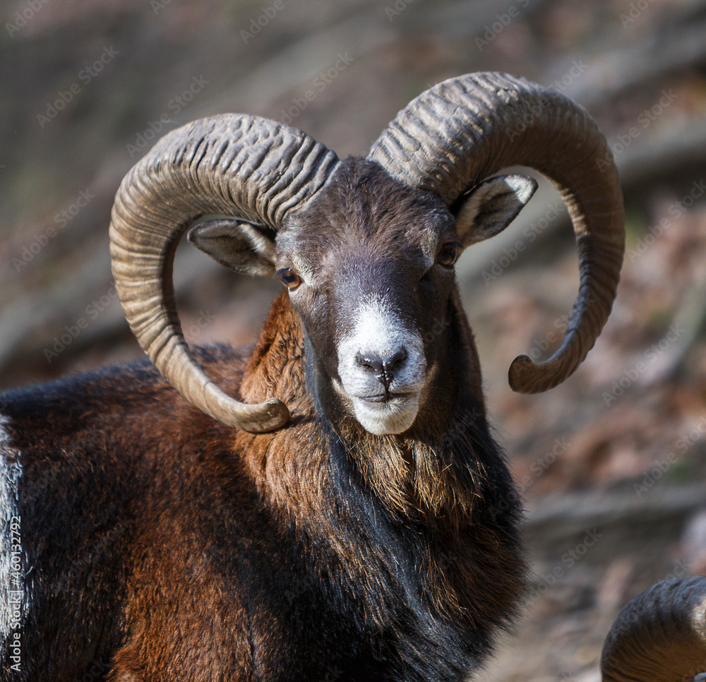 Muflon portrait taken in a transylvanian forest. Romanian wildlife in autumn.