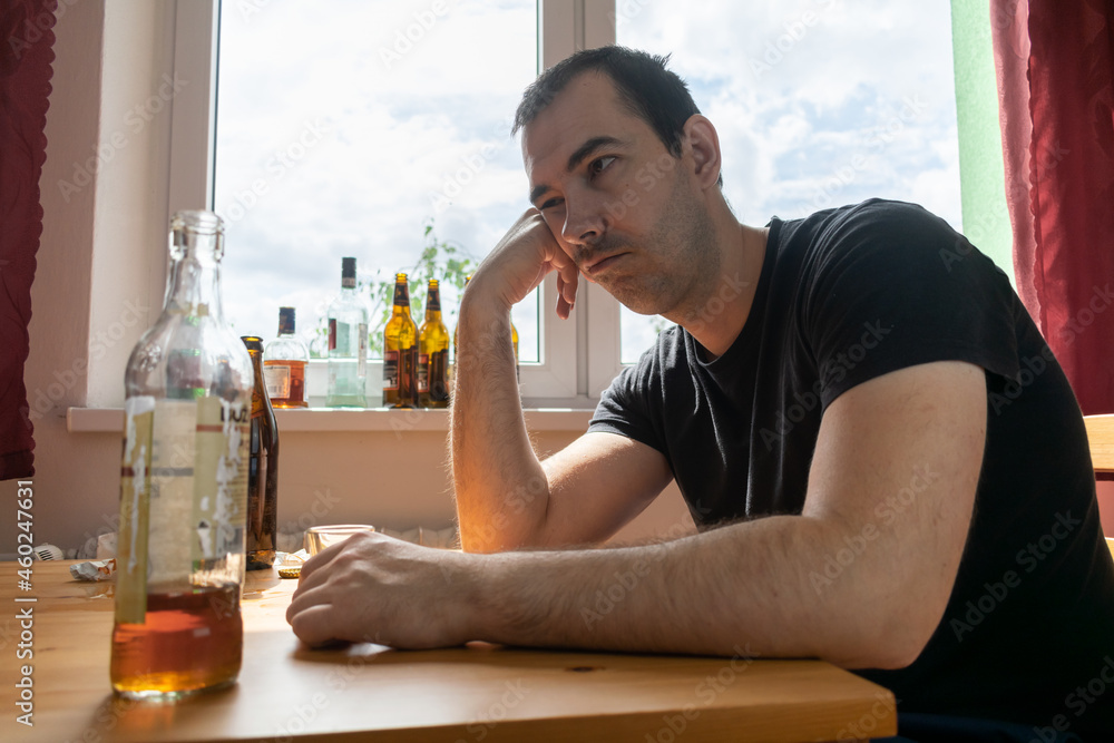 young male man sit next to table drink alcohol bottle at home sad alone alcoholism Signs and Symptoms rehab abuse and recovery problems