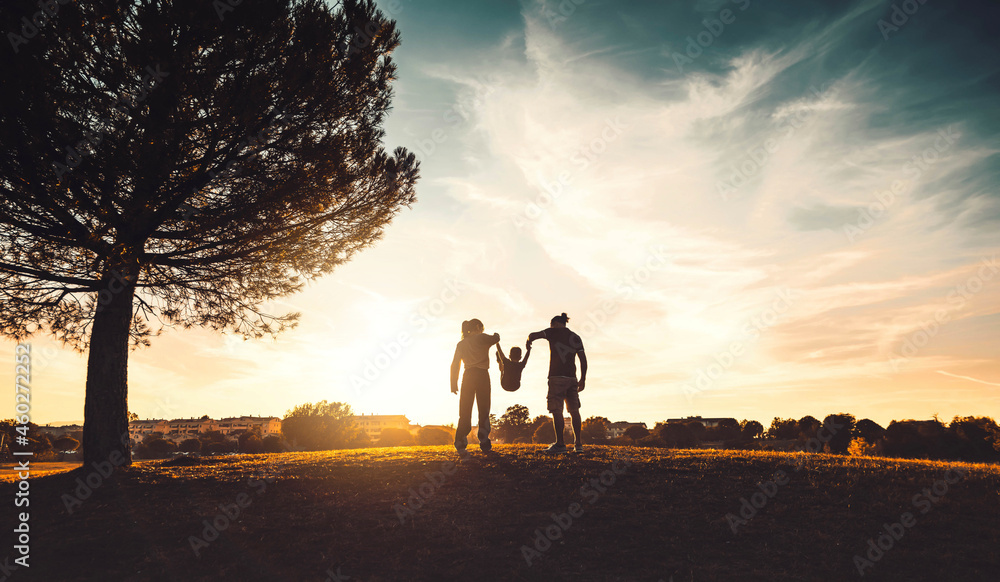 Silhouette of happy family walking in the meadow at sunset - Mother, father and child son having fun outdoors enjoying time together - Family, love, mental health and happy lifestyle concept