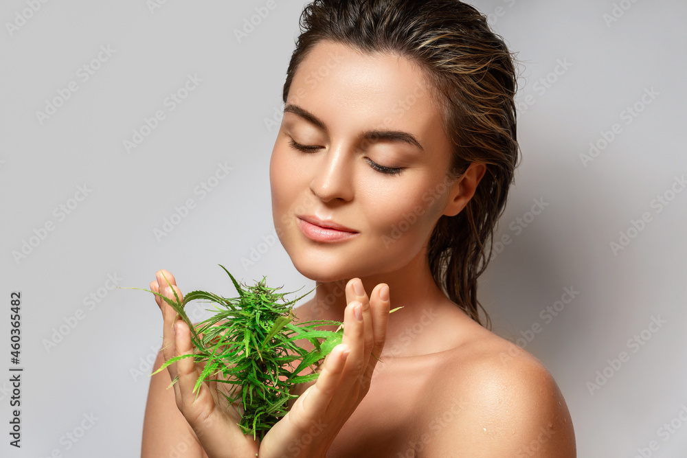 CBD cosmetics concept. Beautiful woman with a cannabis leaf