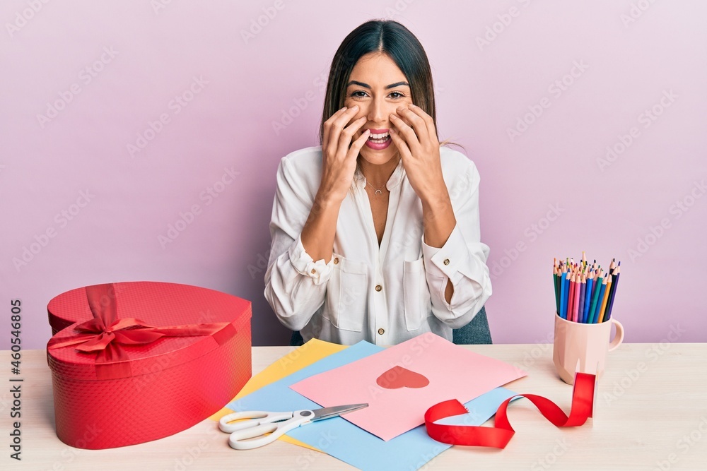 Young hispanic woman making valentine gift sitting on the table laughing and embarrassed giggle covering mouth with hands, gossip and scandal concept
