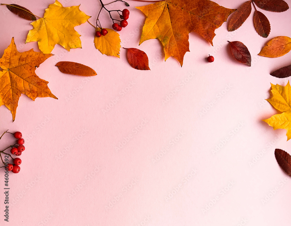 Autumn border banner with natural dried leaves and red berries on bright background, top view, copy space. Autumn, thanksgiving day web banner background, cozy flat lay. Lay out, top view.