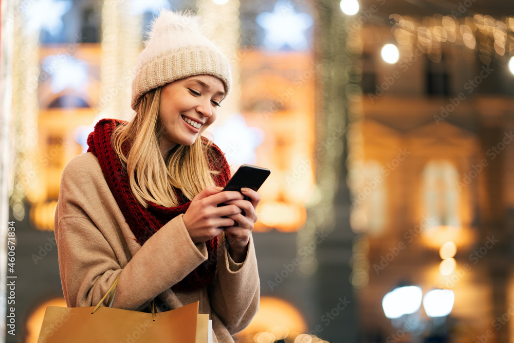 Portrait of young smiling beautiful woman using smartphone on the street at winter