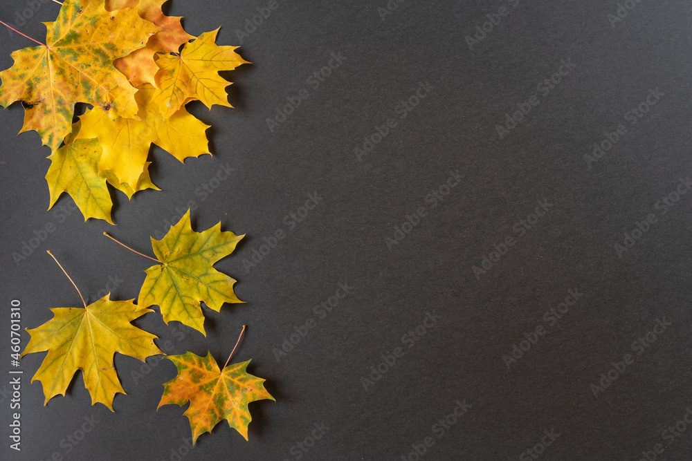 Autumn leaves on a dark gray background from above. With space for text. Maple leaves texture on dark paper.