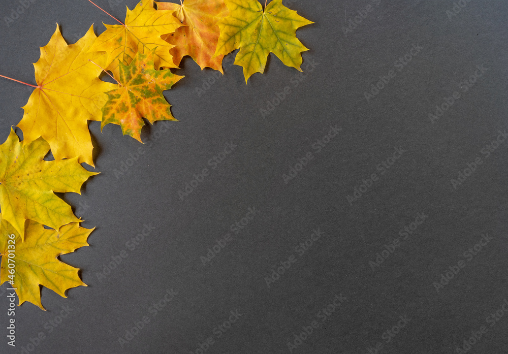 Autumn leaves on a dark gray background from above. With space for text. Maple leaves texture on dark paper.