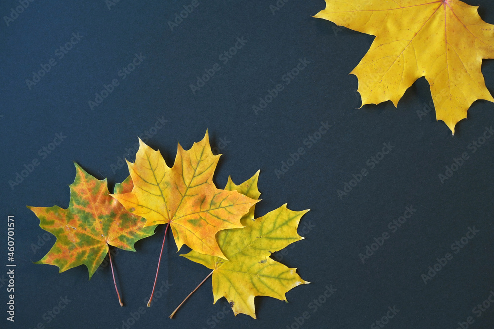 Autumn leaves on a dark blue background from above. With space for text. Maple leaves texture on dark paper.