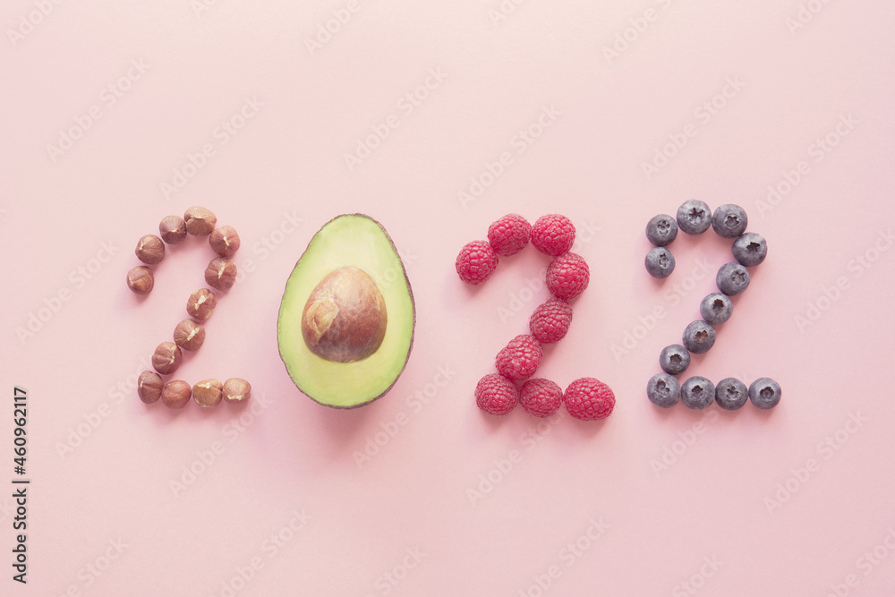 2022 made from healthy fuit and nut on pink background, Happy New year, health diet resolution, goals and lifestyle wellness concept