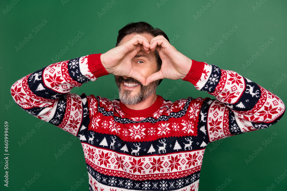 Photo portrait man in sweater smiling looking in heart sign on date playful isolated pastel green color background