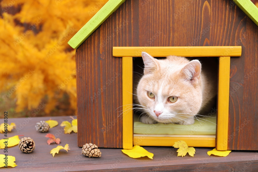 A red cat sits in pet house among foliage and pinecones on a wooden bench on the background of autumn larch. Concept of autumn and cozy.