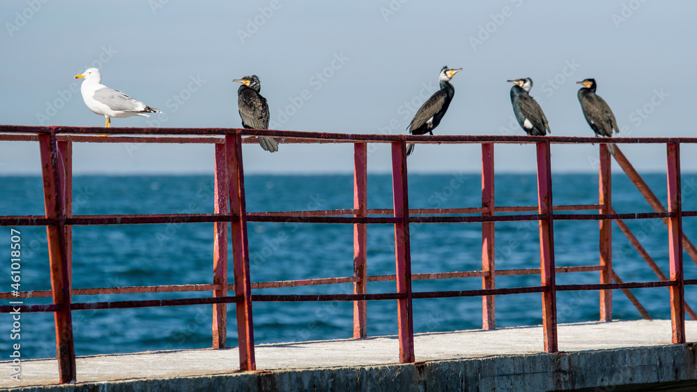 Birds (cormorants and seagull) sitting on rails of pier against the sea on sunny day. Black Sea, Krasnodar Krai, Russia.