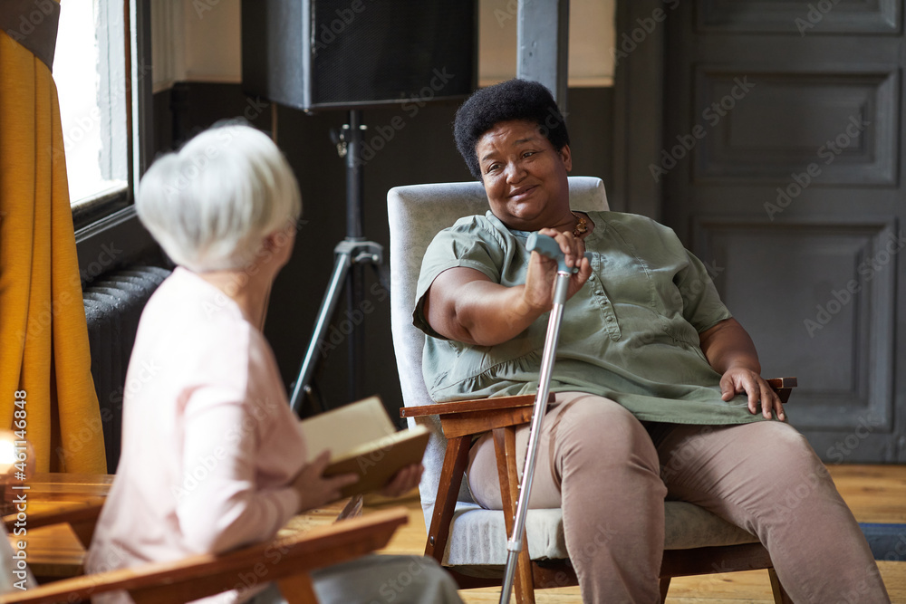 Portrait of senior African-American woman talking to friends while enjoying retirement in nursing home