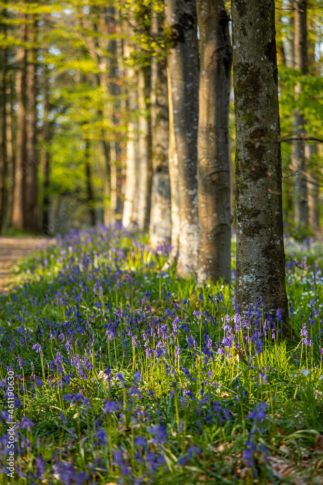Clochettes bleues au pieds des arbres d'une forêt au printemps.