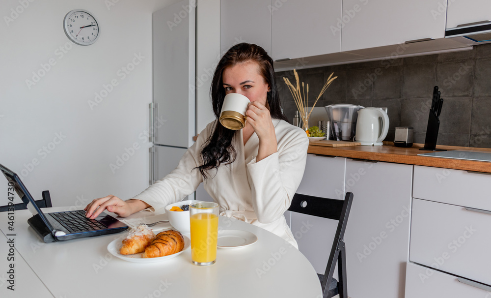 Young woman in comfortable white robe works on laptop while sitting at table the kitchen. Work at home for breakfast.