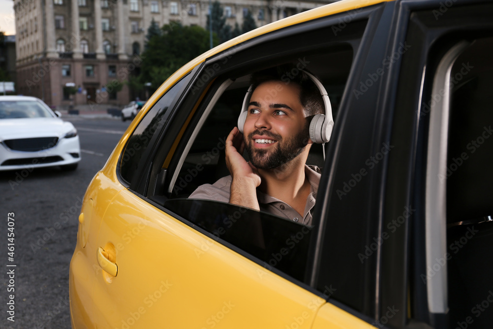Handsome young man with headphones in taxi outdoors
