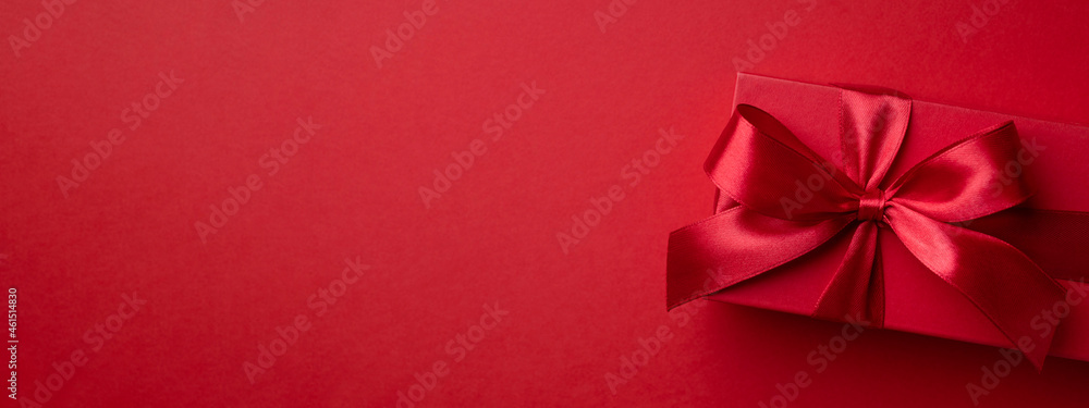 Banner with red gift box on red background for Christmas or Valentine's day.