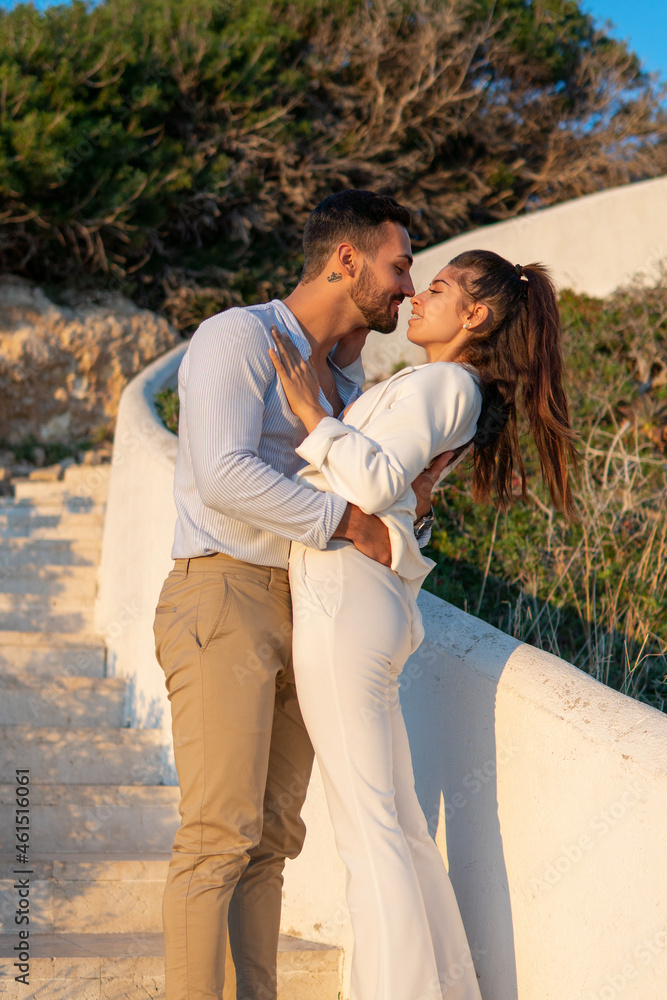 Loving Hispanic couple embracing on stairs in evening