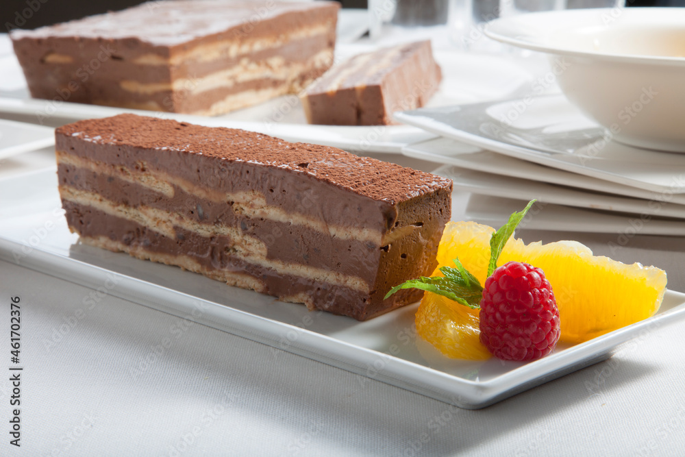 Postre, tarta de dos chocolates acompañados de naranja y frambuesa. Dessert, two chocolate cake accompanied by orange and raspberry.