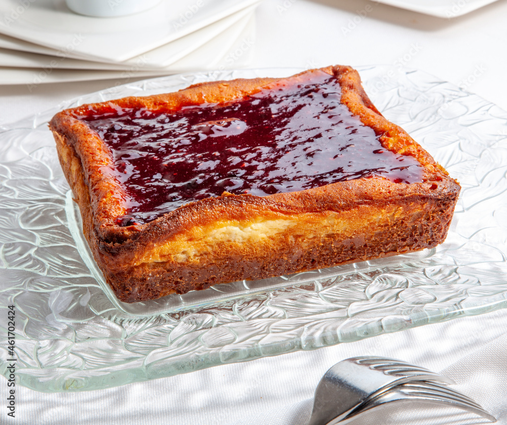 Pastelería, tostada con mermelada de fresa. Pastry, toast with strawberry jam.