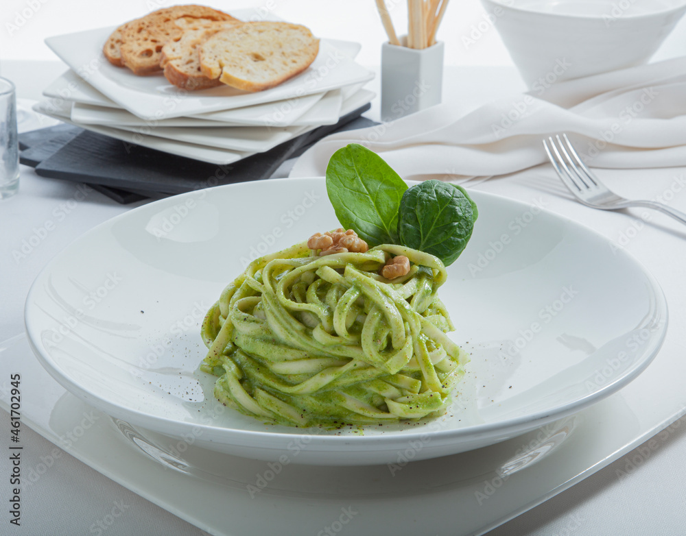 Spaghetti de calabacín con salsa pesto. Zucchini spaghetti with pesto sauce.