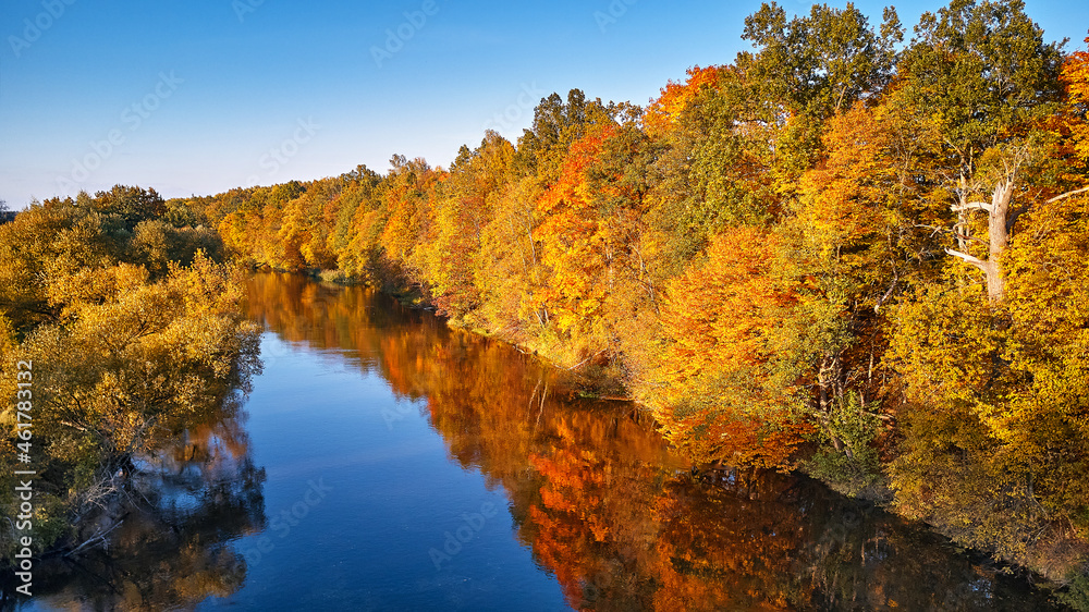 autumn sunny landscape, rural aerial scene - stock photo. Fall colorful trees reflecting in water, picturesque background