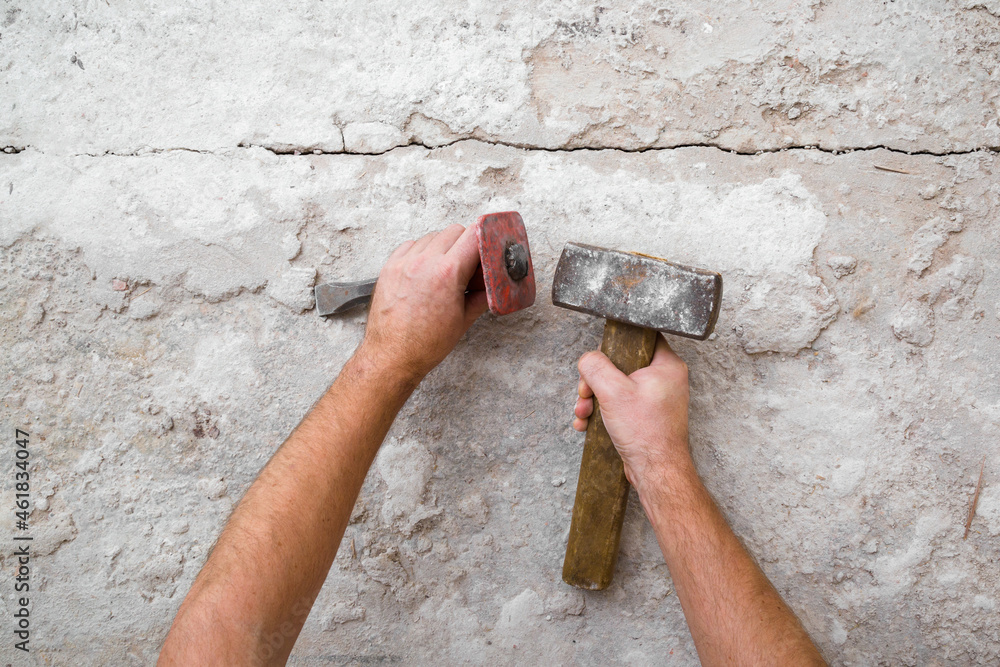 Young adult man hands using sledgehammer, metal stone chisel and removing old concrete on floor. Closeup. Point of view shot. Preparing for repair work of home. Flooring restoration. Top down view.