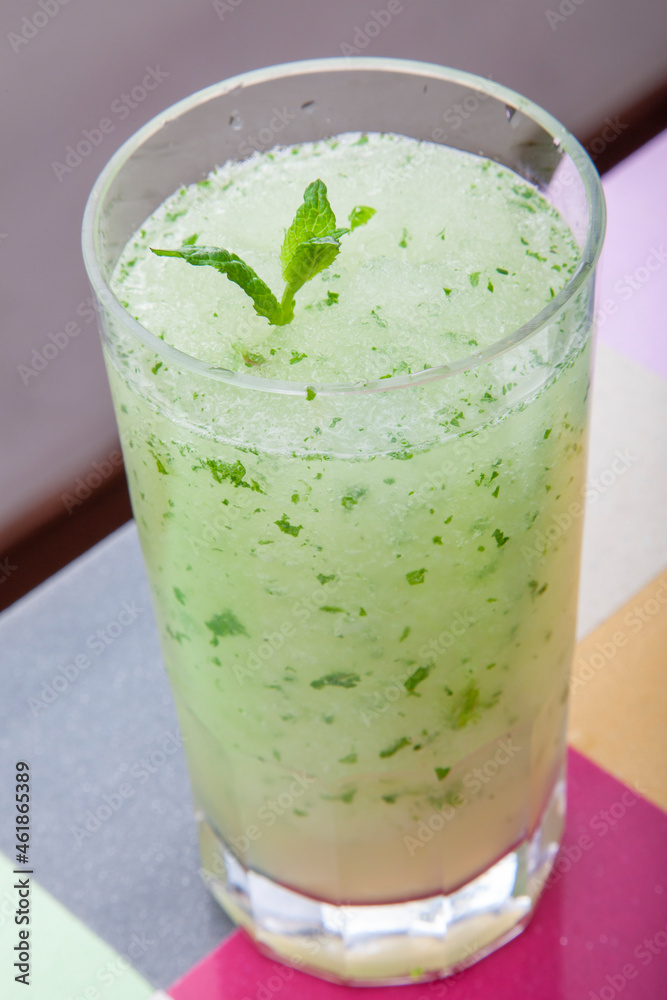 mojito con hielo con hiervabuena, visto desde arriba. mojito with ice with herbs, seen from above