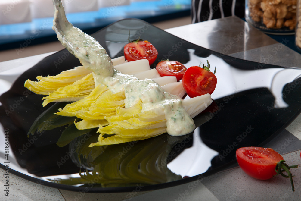 Ensalada de endivias con salsa de queso y tomates cherry. Endive salad with cheese sauce and cherry tomatoes