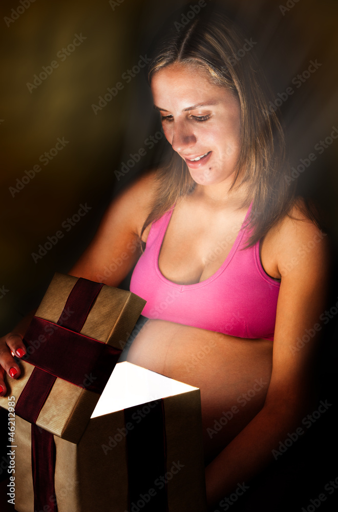 Pregnant Woman Opening a Gift Box with a Christmas Present