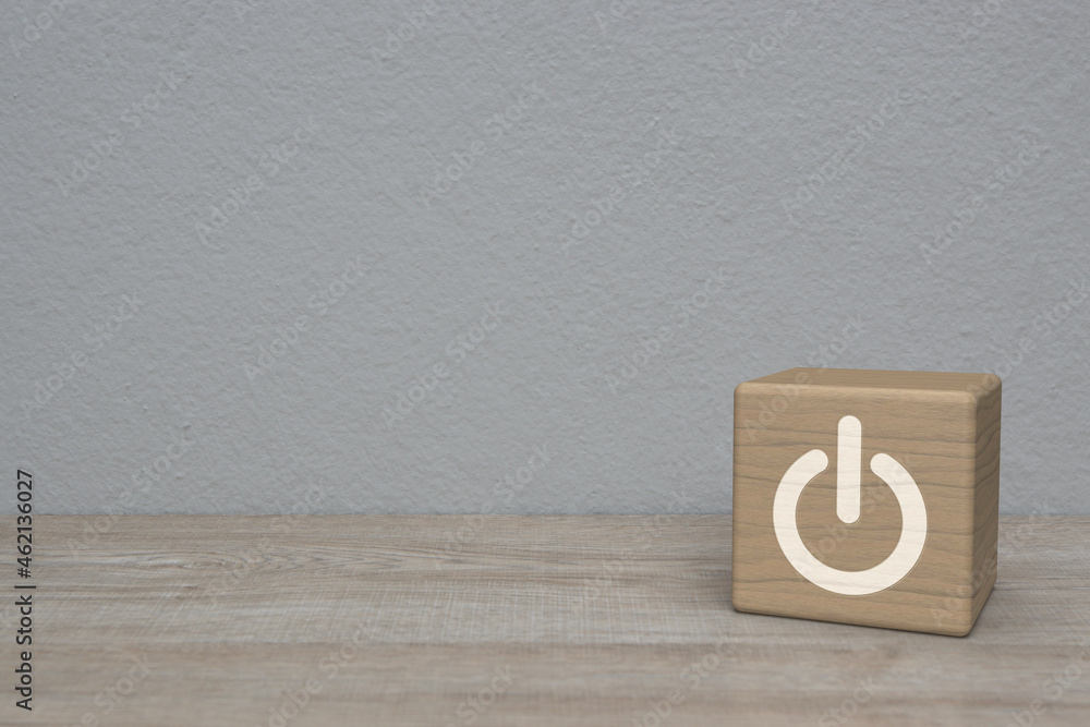 Power button icon on wood block cube on wooden table over white wall background, Start up business concept