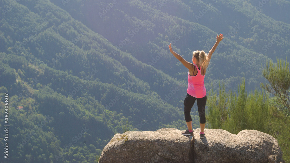 Rapariga a fazer terapia de bem estar em cima de uma pedra no topo de uma montanha, viagem, equilíbrio, em posição de exercício de yoga