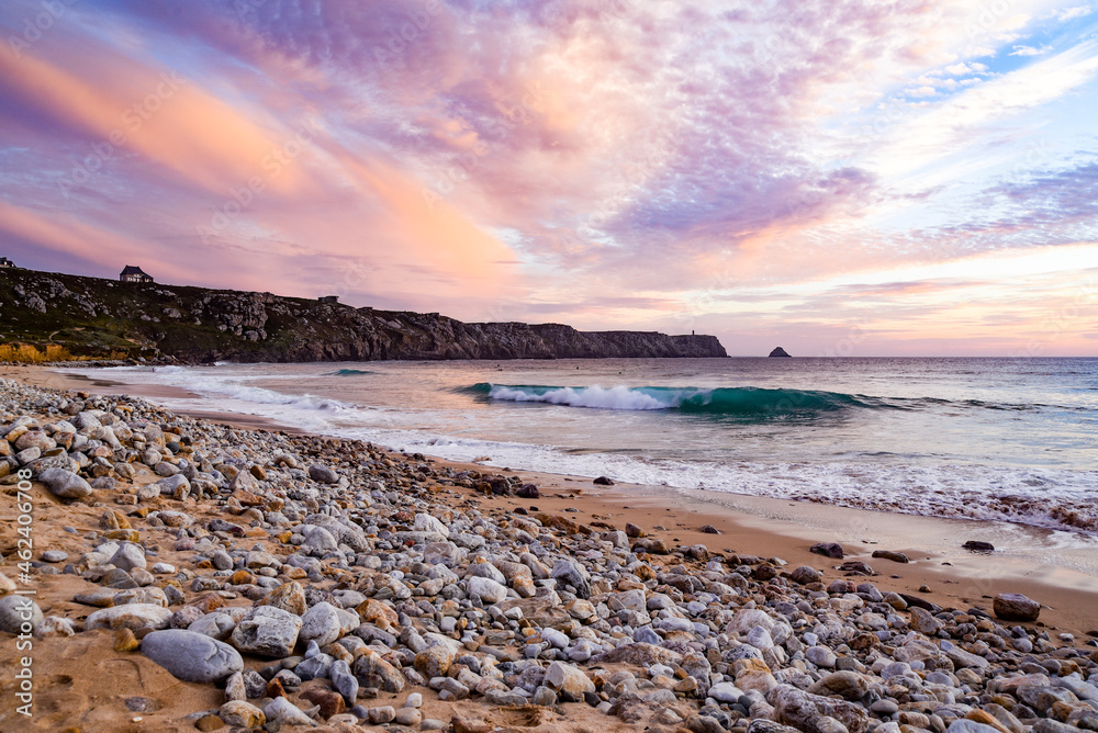 Purple sunset on the coast of France in Crozon, pen hat beach.