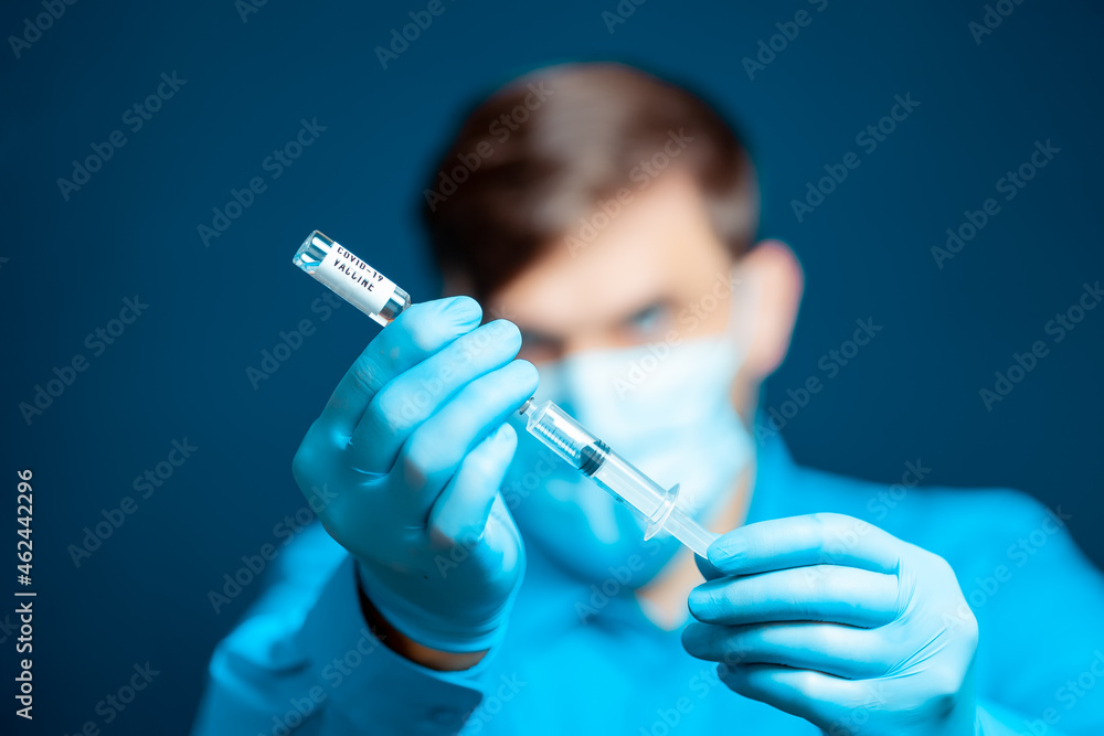 a doctor in a medical mask and gloves, dressed in a blue uniform, dials the vaccine into a syringe