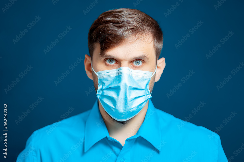 a doctor in a medical mask and gloves, dressed in a blue uniform