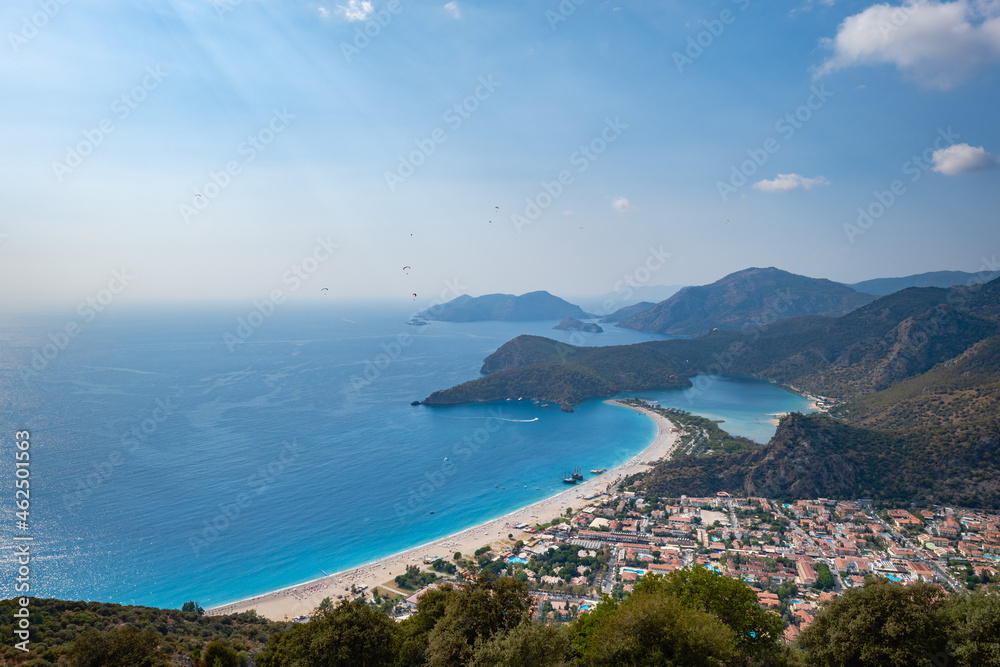 Oludeniz blue lagoon and sand beach in Fethiye, Turkey. Turquoise Coast of southwestern Turkey, taken on Lycian way hiking track on sunny bright day with blue sky in Oludeniz.