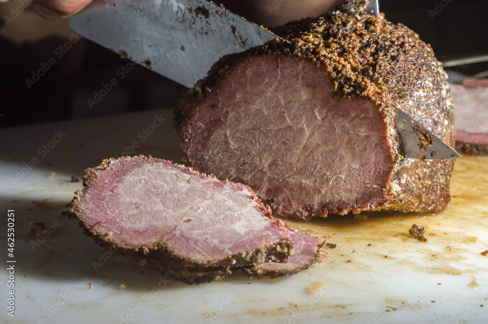 meat with the name of "cupim", hump steak, cut of beef from the upper part of the ox, widely consumed in Brazil, smoked and sliced on a white board, copy space and selective focus
