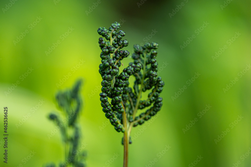 close up of some grapefern leaves on the thin branch with blurry green background