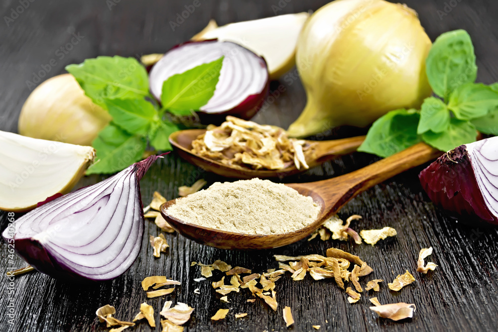 Onion powder and flakes in spoons on board