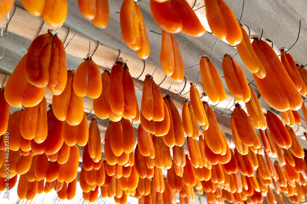 Sea mullet caviar. Drying process of caviar obtained from mullet caught in the lagoon in Karataş district of AdanaTurkey.