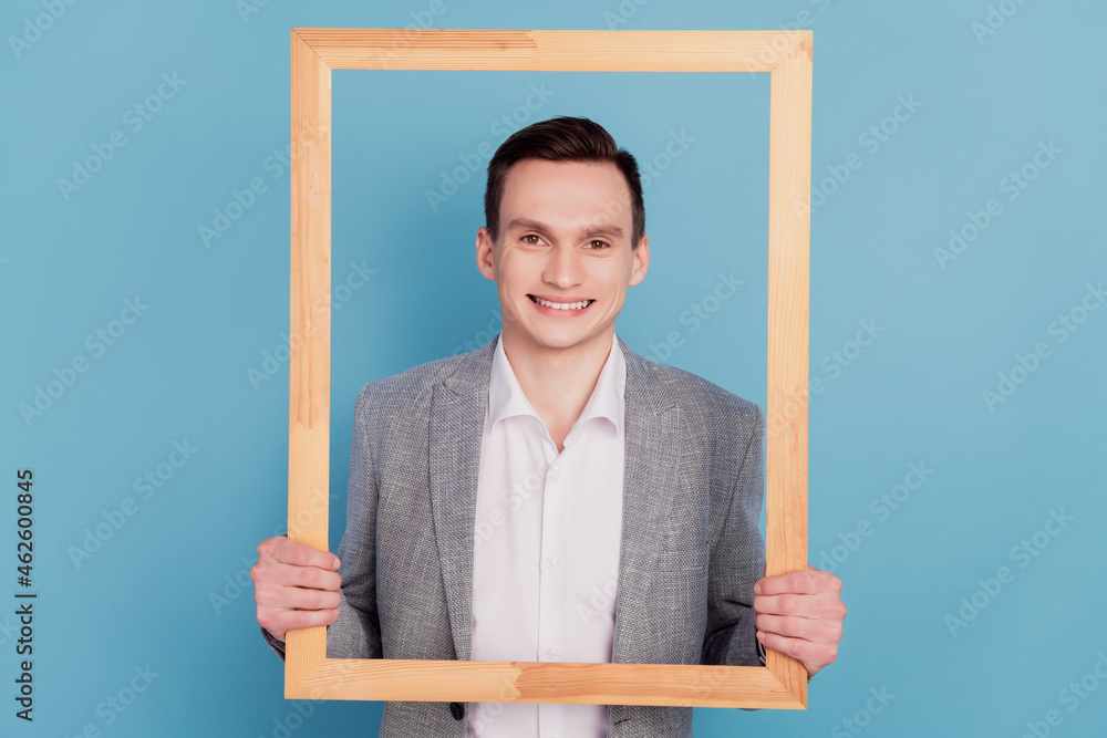 Portrait of funky cheerful handsome man hold wooden frame make picture isolated over blue color background
