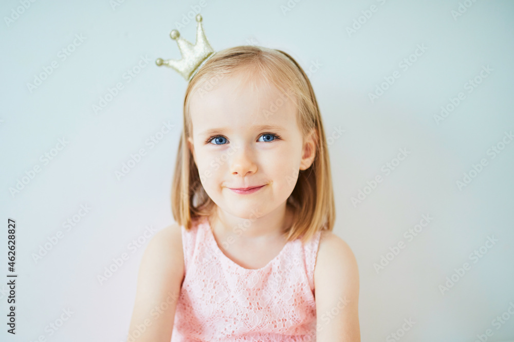 Adorable little girl in pink dress and golden crown dressed as princess