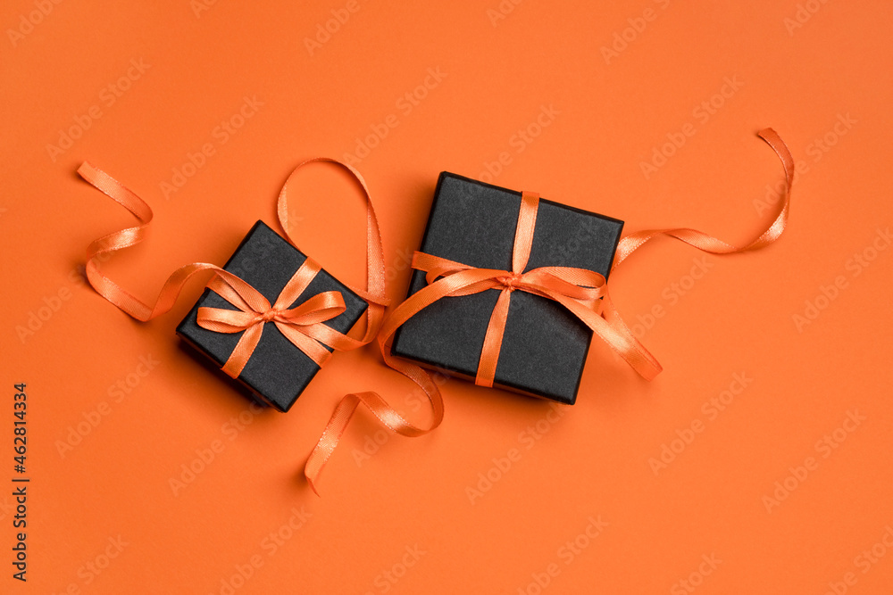 Black gift boxes tied with orange ribbons on an orange background. Halloween concept.