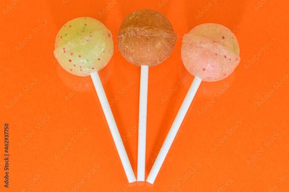 Set of lollipops on orange background. Big bright tasty lollipops on white sticks on orange background with copy space. Sweet candy concept