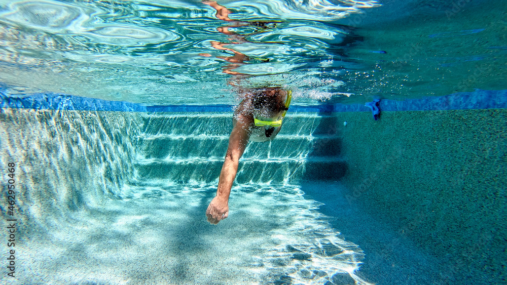 A man swimming freestyle in a swimming pool in on a sunny day in Florida.
