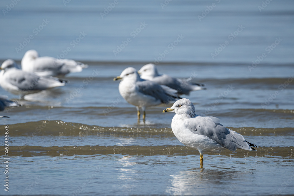 small group of seagulls resting on the coast with waves washing on the sandy beach