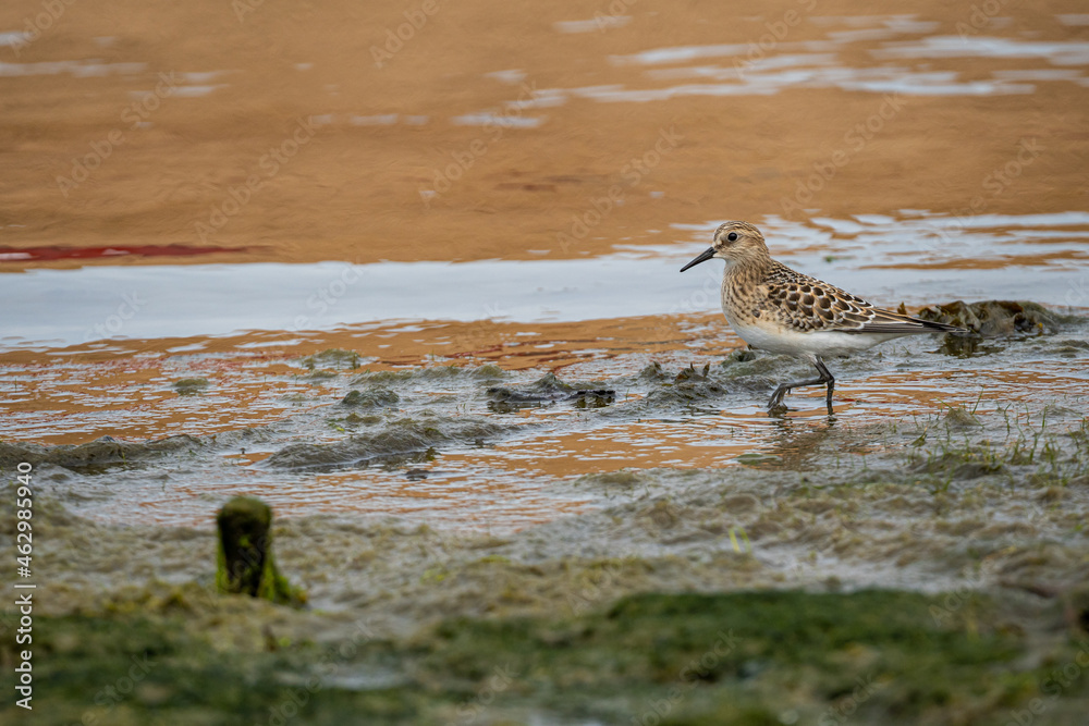 one cute dunlin bird walking around muddy beach by the river searching for food